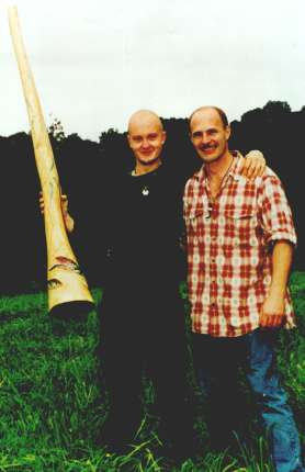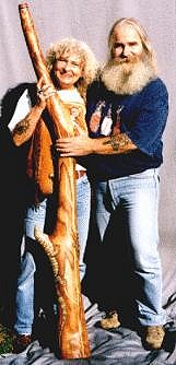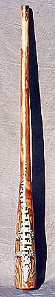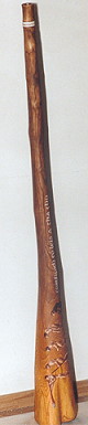 Charly McMahon präsentiert stolz sein neüs Eddy Halat Didge, welches er anlässlich des ersten Didgeridoo- spielertreffens im Schwarzwald 1999 von Eddy Halat bekommen hatte Holzart: Zwetschge Tonart: E Länge: 165 cm Trichter: 14 cm Artwork: Bemalung mit Gecko und Ranken |