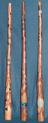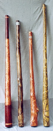 Holzart: Alle vier Instrumente aus Esche die drei Didges rechts sind in "double stained" eingefärbt Verschiedene Tonlagen und Artwork Ganz links ein Instrument im neuen "Eva-Halat-Special" Style. |
