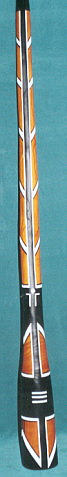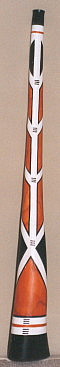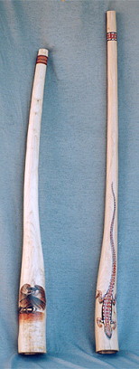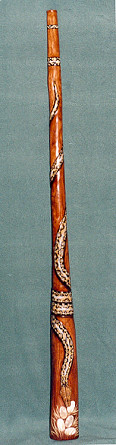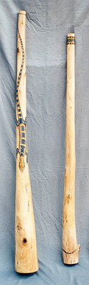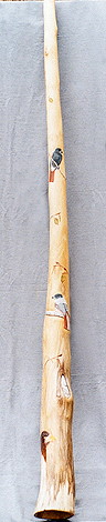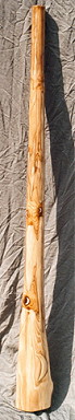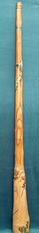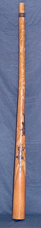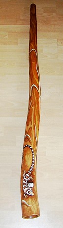 auch dieses: Holzart: Esche Tonart: Dis Länge: 170 cm Trichter: 18 cm Artwork: Grundfarbe "doublestained", 3 Schnitzereien: Waran, Schnabeltier, Schildkröte und Bemalungen Heute im Besitz der Schweizer Felicitas und Gerhard Finke |