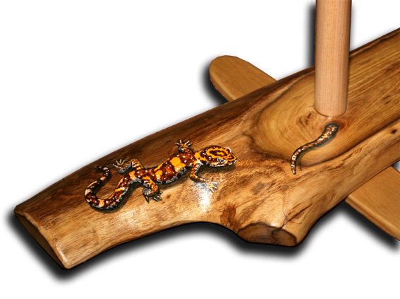 Holzart: Robinie Tonart: DIS Länge: 160 cm Artwork: geschnitzte und gemalte Echse mit Eiern und Jungen |